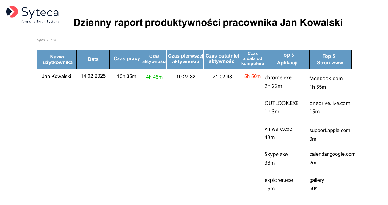 Jeden z raportów w przejrzysty sposób podsumuje aktywności Twojego pracownika z wybranego okresu i pokaże Ci najczęściej używane przez niego aplikacje, strony www oraz ile czasu spędził na korzystaniu z nich.